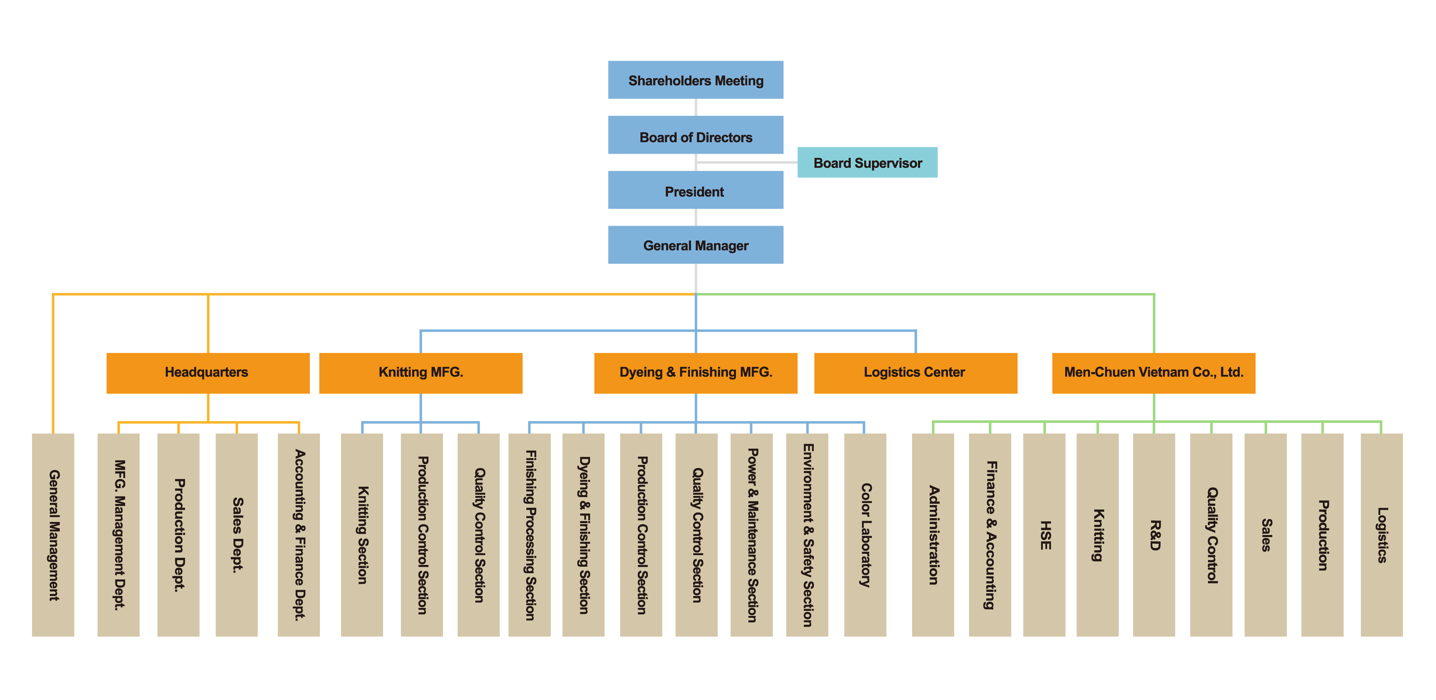 Each department and division comprised of its own responsible unit overseeing the performance and productivity within its own territory. Through effective communication and organized structure, all departments and divisions form a solid foundation as Men-Chuen’s backbone and fully support Men-Chuen towards globalization.