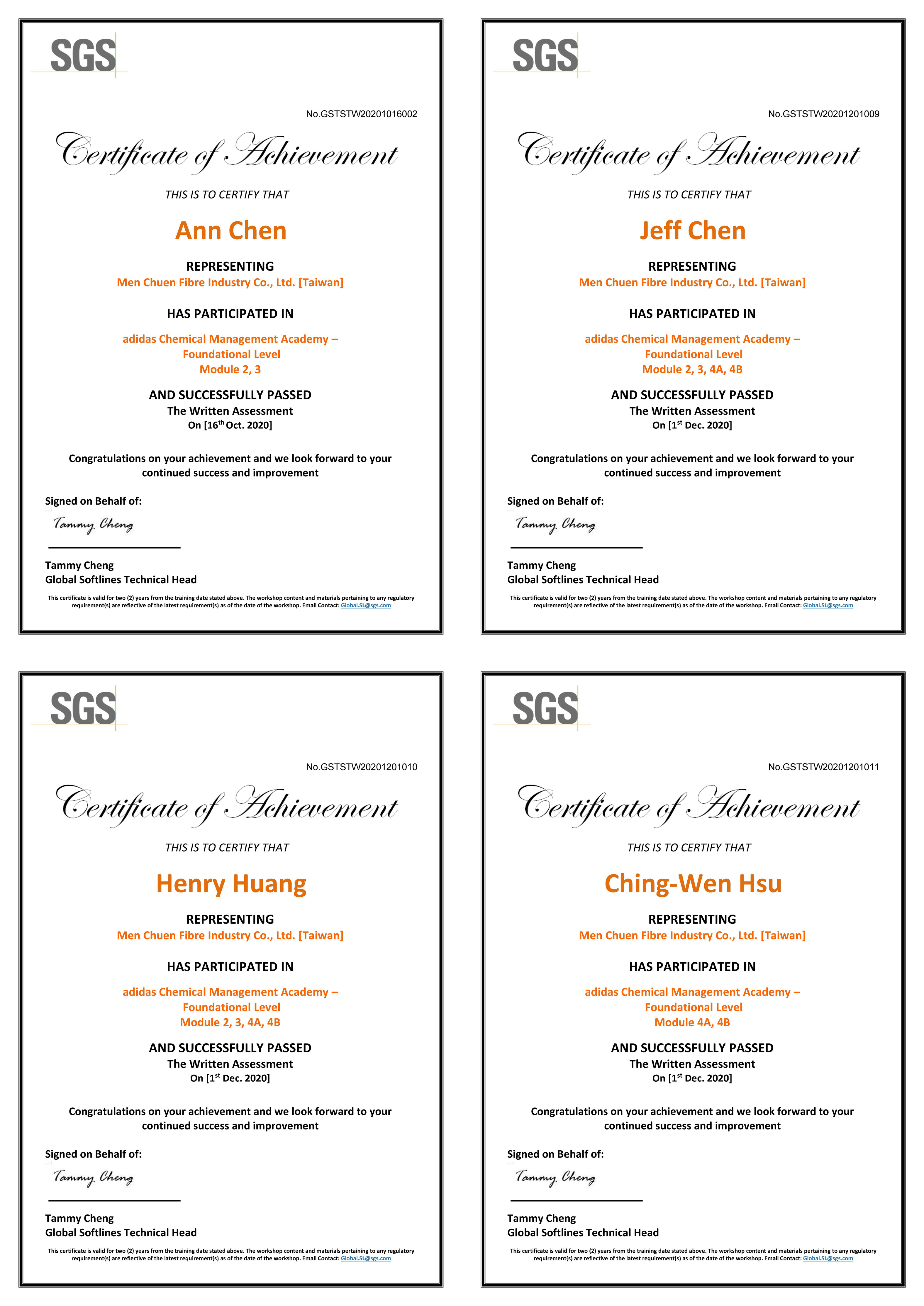 In the textile industry, chemicals are frequently used in the dyeing and finishing processes. Without proper handling and treatment, negative impact to the environment is foreseeable. To mitigate this impact, Men-Chuen team members participated in Adidas’ aCMA (Adidas Chemical Management Academy) Training. In this training, we learned how to properly manage chemical handling, usage and discharge. Through proper management, we can reduce the environmental impact during production processes and deliver safe, non-toxic quality products to our customers while preserving our environment.