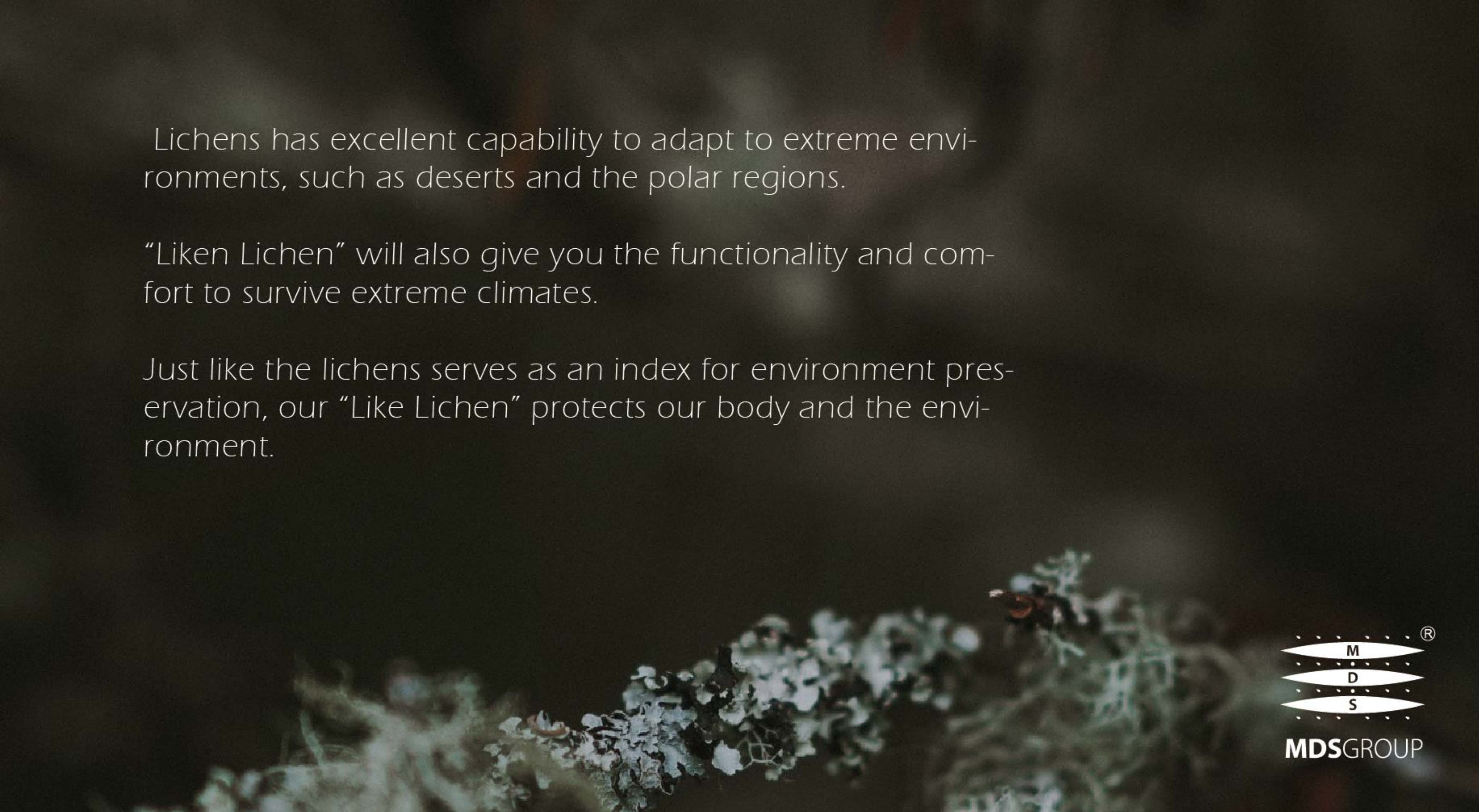 In this exhibition, Yoday Peng will introduce LIKEN LICHEN. The lichen has excellent capability to adapt to extreme environments. In extreme drought, the lichen can dehydrate and become dormant. When the outside condition improves, they will bounce back with exponential growth, therefore it can be the frontier of a new habitant. In the LIKEN LICHEN, the unique design of French terry is very similar to lichens in appearances.