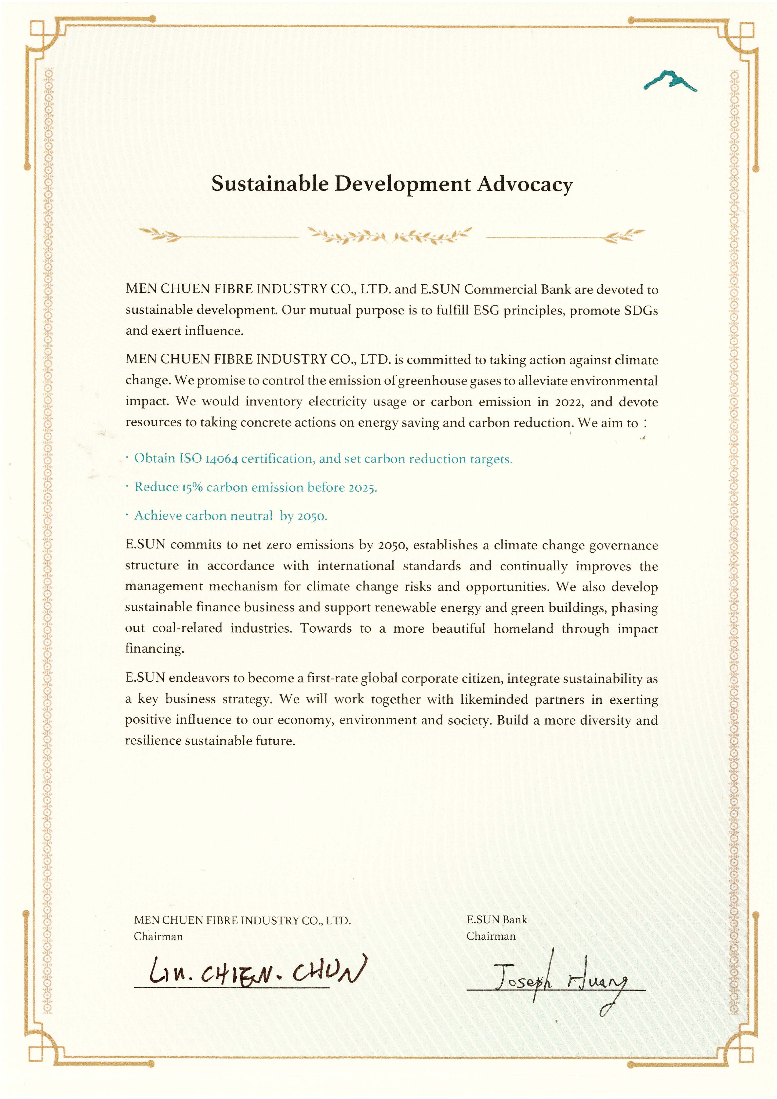 E.SUN ESG Sustainable Advocacy is initiated by E.SUN and likeminded partners in exerting positive influence to our economy, environment and society. By signing the Sustainable Development Advocacy, we show our dedication to control greenhouse gas emission and alleviate the impact of climate change to our environment.