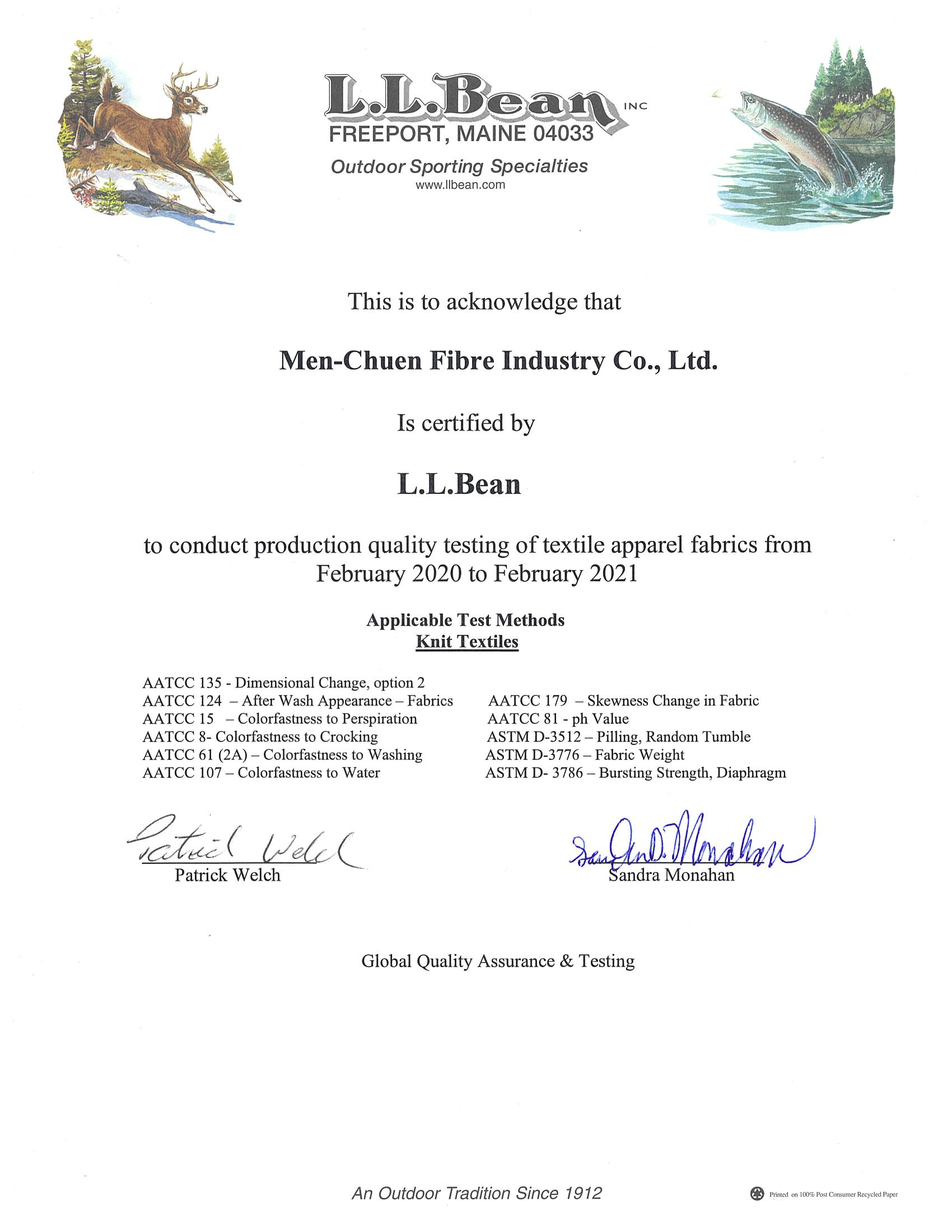 2020綿春檢驗中心實驗室L.L. Bean證書