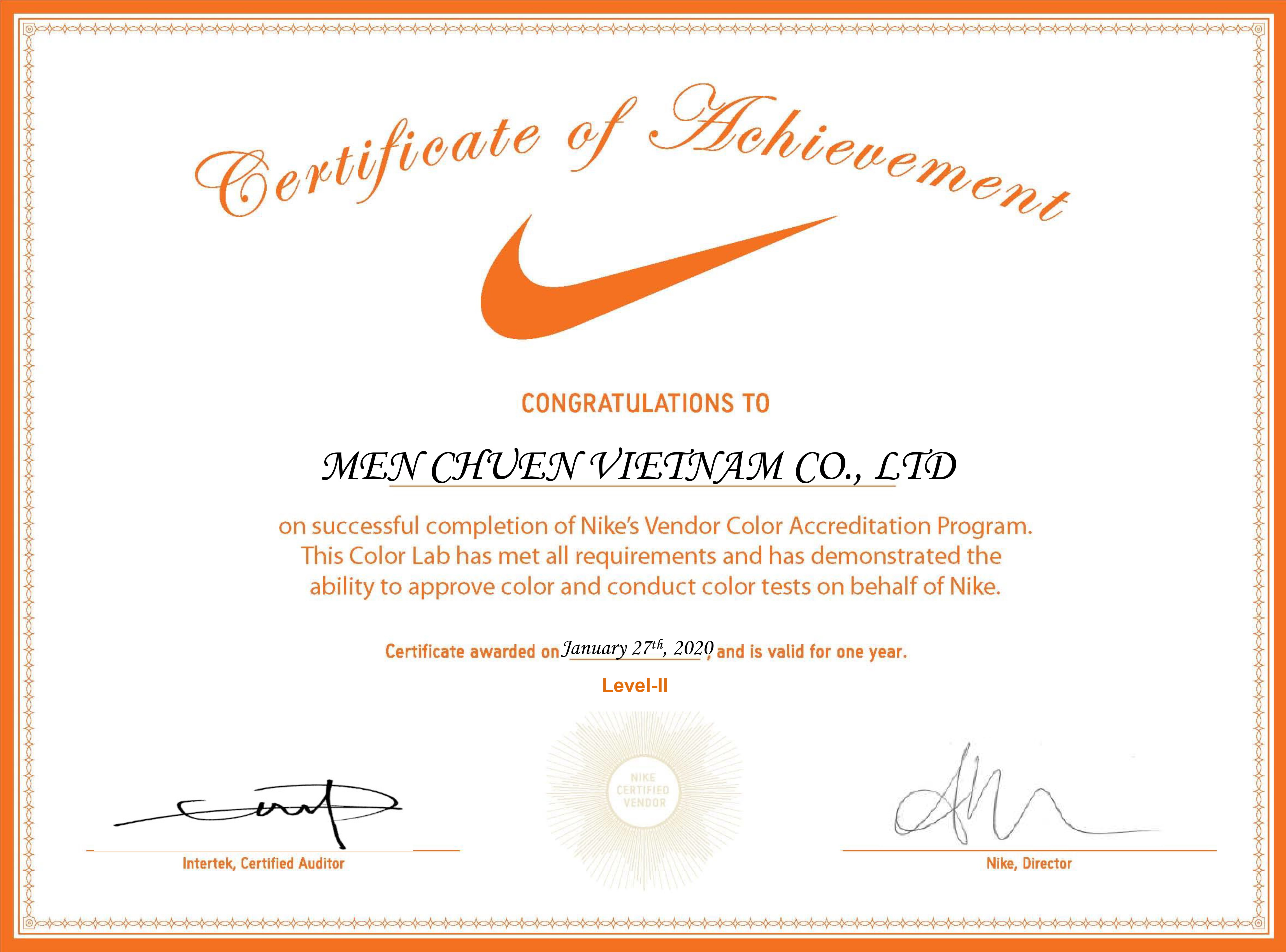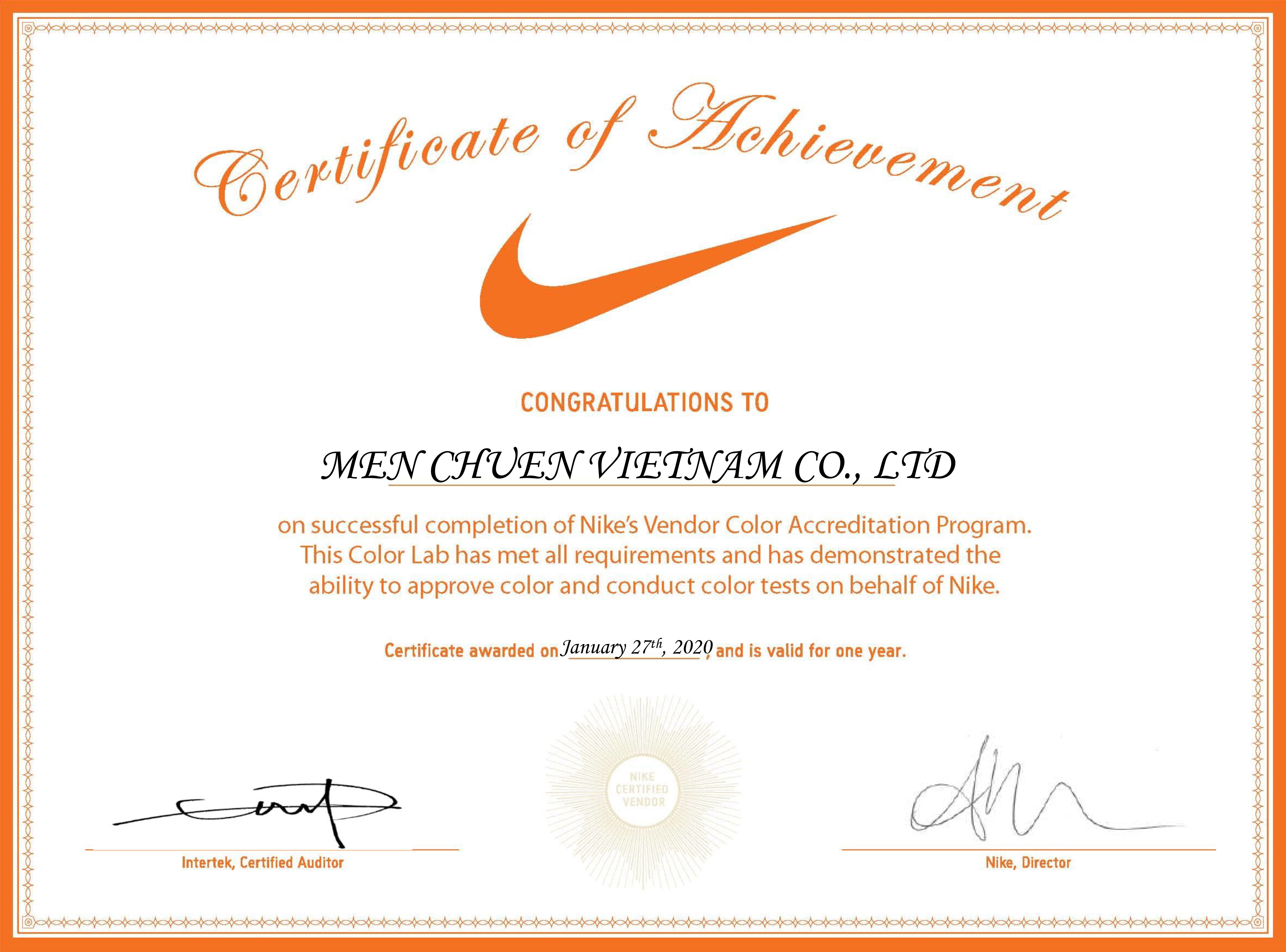 2020 綿春越南責任有限公司Nike VCA色彩管理證書