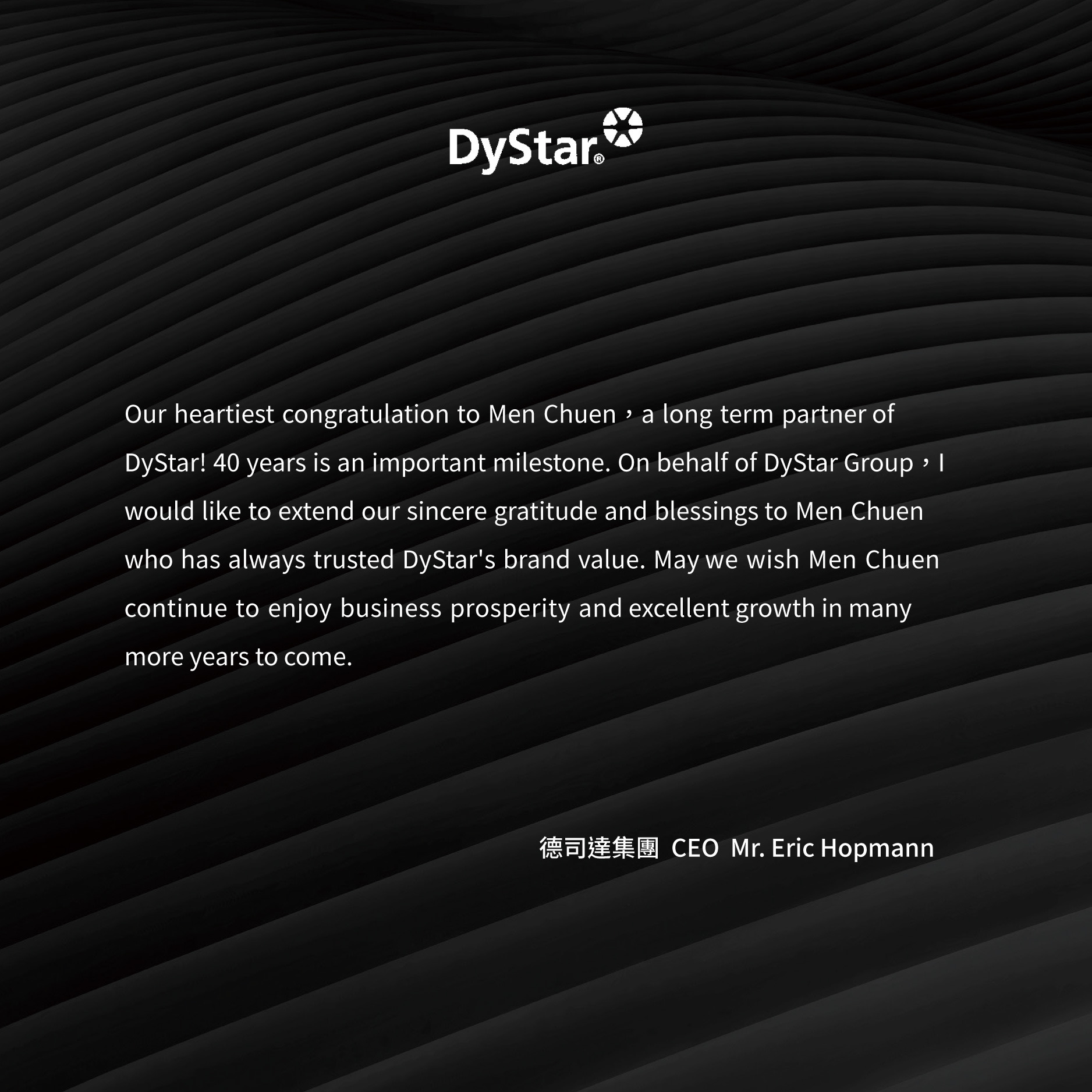 Our heartiest congratulation to Men Chuen,a long term partner of DyStar! 40 years is an important milestone. On behalf of DyStar Group,I would like to extend our sincere gratitude and blessings to Men Chuen who has always trusted DyStar's brand value. May we wish Men Chuen continue to enjoy business prosperity and excellent growth in many more years to come.