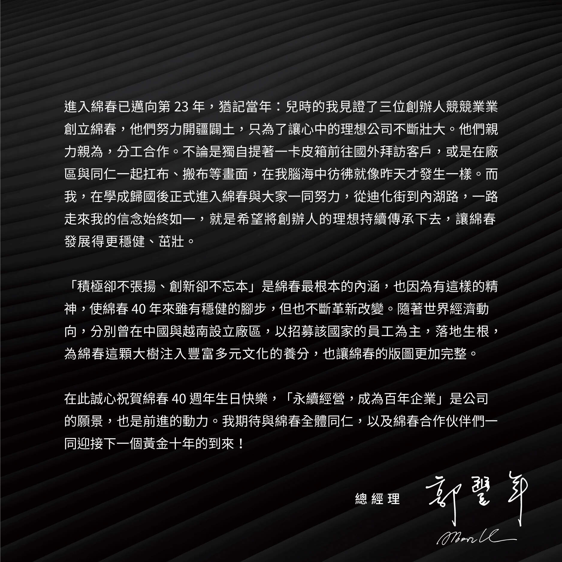 在此誠心祝賀綿春 40 週年生日快樂,「永續經營,成為百年企業」是公司的願景,也是前進的動力。我期待與綿春全體同仁,以及綿春合作伙伴們一同迎接下一個黃金十年的到來!
