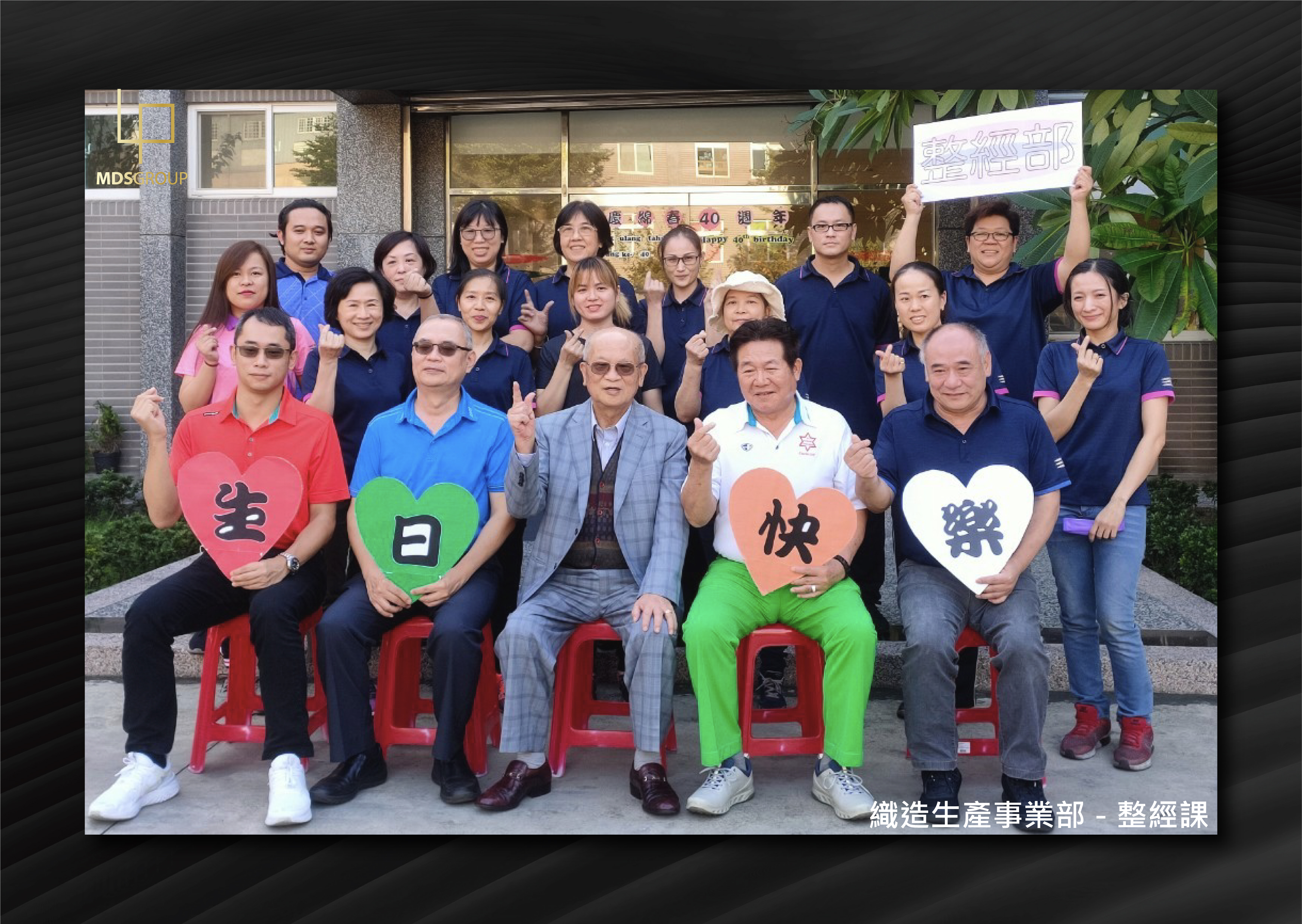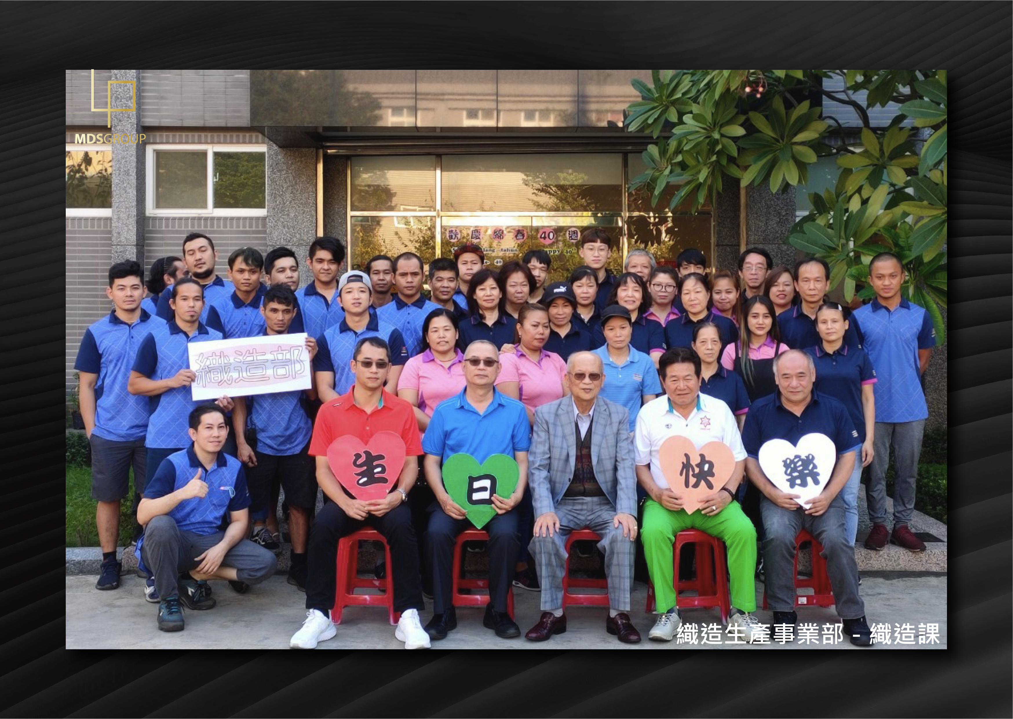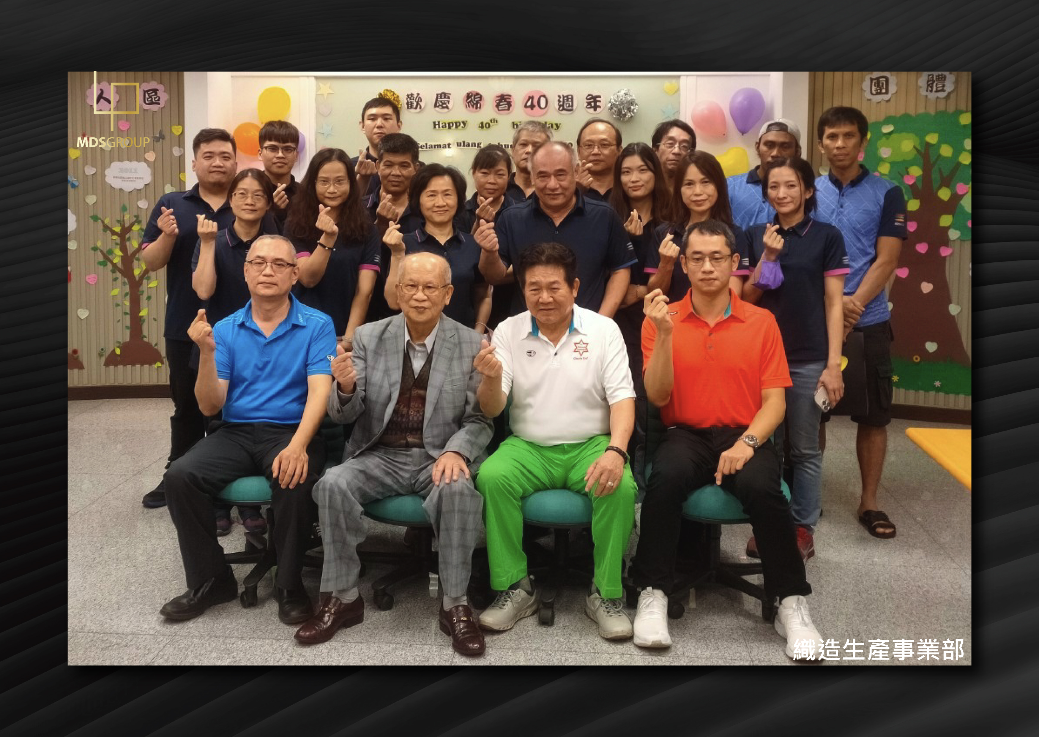繁忙的時刻總是過的特別快,台灣織造生產事業部的同仁,在各自的工作領域中展現長才;此次為了歡慶40週年,董事長、資深副總經理、副總經理、織造廠長、協理特別撥空與同仁們合照,並藉此機會與員工接觸交談,讓員工感受到長官們的關愛與呵護;綿春一直秉持「員工好、公司就會好」的理念,持續帶領公司全體員工邁向下個里程碑。