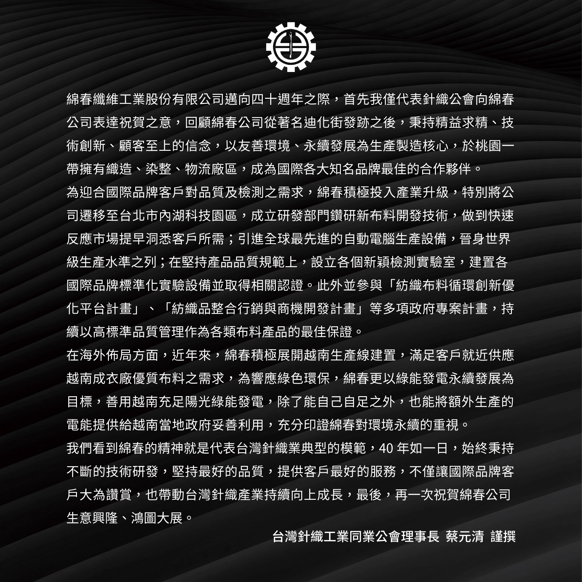 綿春纖維工業股份有限公司邁向四十週年之際,首先我僅代表針織公會向綿春公司表達祝賀之意,回顧綿春公司從著名迪化街發跡之後,秉持精益求精、技術創新、顧客至上的信念,以友善環境、永續發展為生產製造核心,於桃園一帶擁有織造、染整、物流廠區,成為國際各大知名品牌最佳的合作夥伴。