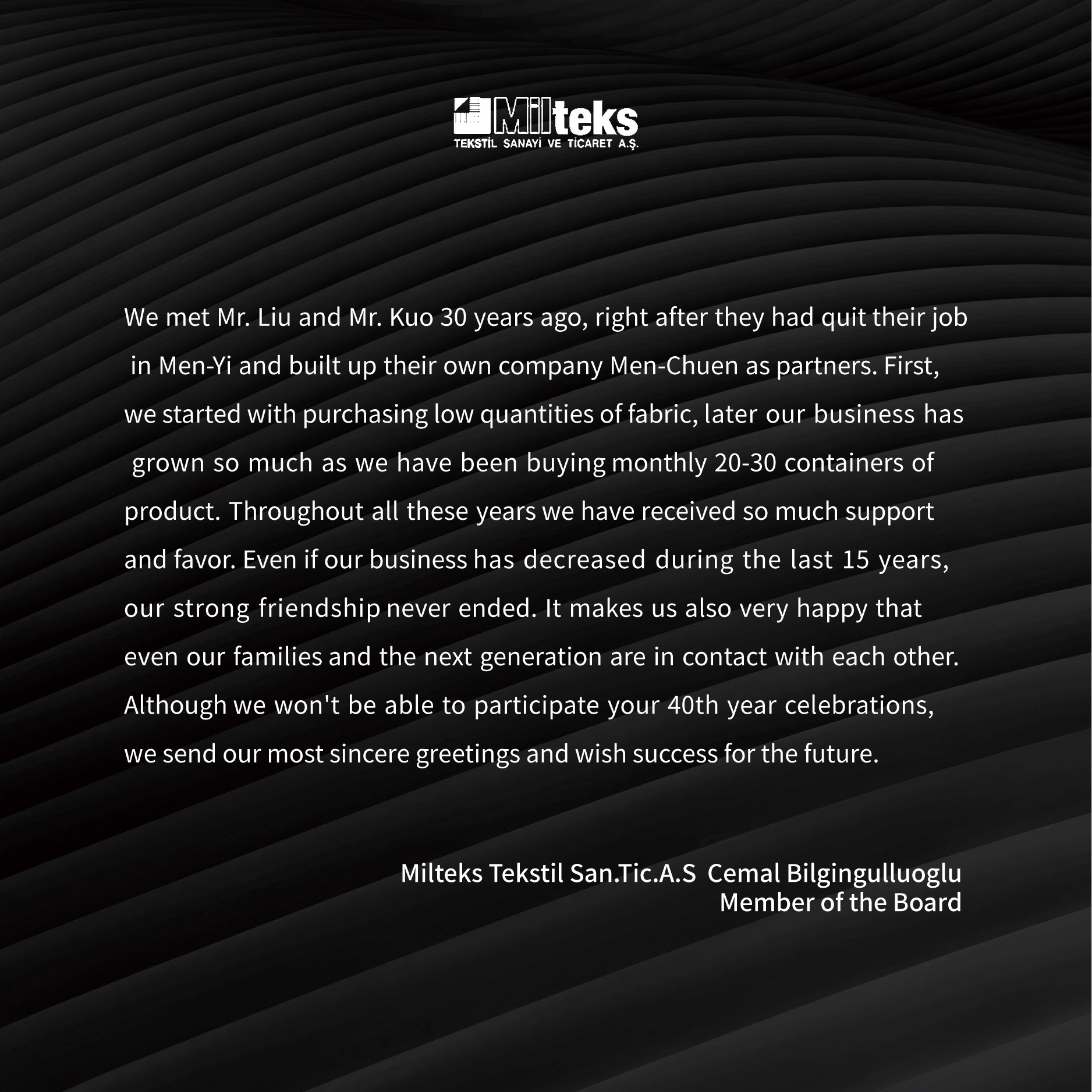 We met Mr. Liu and Mr. Kuo 30 years ago, right after they had quit their job in Men-Yi and built up their own company Men-Chuen as partners. First, we started with purchasing low quantities of fabric, later our business has grown so much as we have been buying monthly 20-30 containers of product. Throughout all these years we have received so much support and favor. Even if our business has decreased during the last 15 years, our strong friendship never ended. It makes us also very happy that even our families and the next generation are in contact with each other. Although we won't be able to participate your 40th year celebrations, we send our most sincere greetings and wish success for the future.