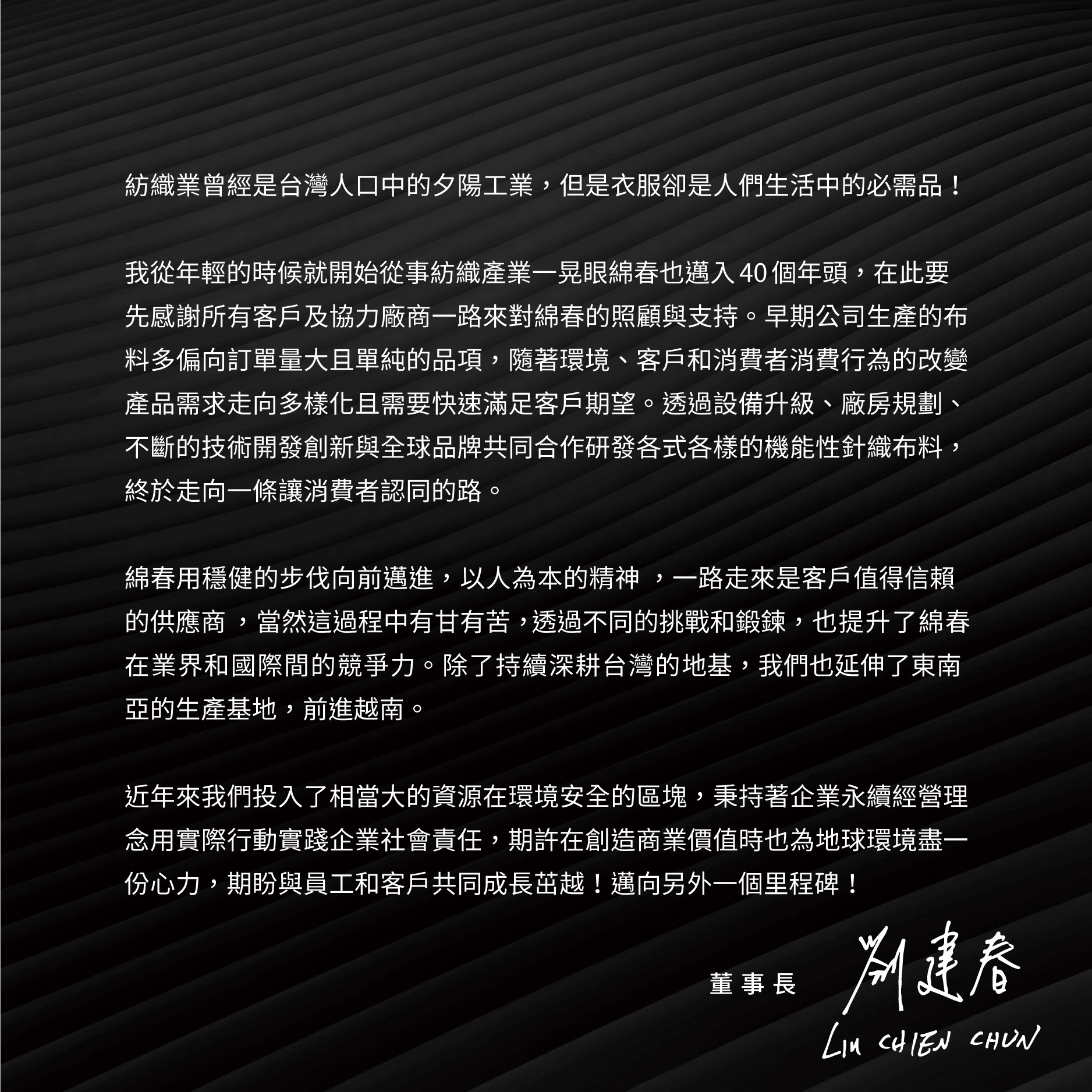 我從年輕的時候就開始從事紡織產業一晃眼綿春也邁入40個年頭,在此要先感謝所有客戶及協力廠商一路來對綿春的照顧與支持。早期公司生產的布料多偏向訂單量大且單純的品項,隨著環境、客戶和消費者消費行為的改變產品需求走向多樣化且需要快速滿足客戶期望。透過設備升級、廠房規劃、不斷的技術開發創新與全球品牌共同合作研發各式各樣的機能性針織布料,終於走向一條讓消費者認同的路。
