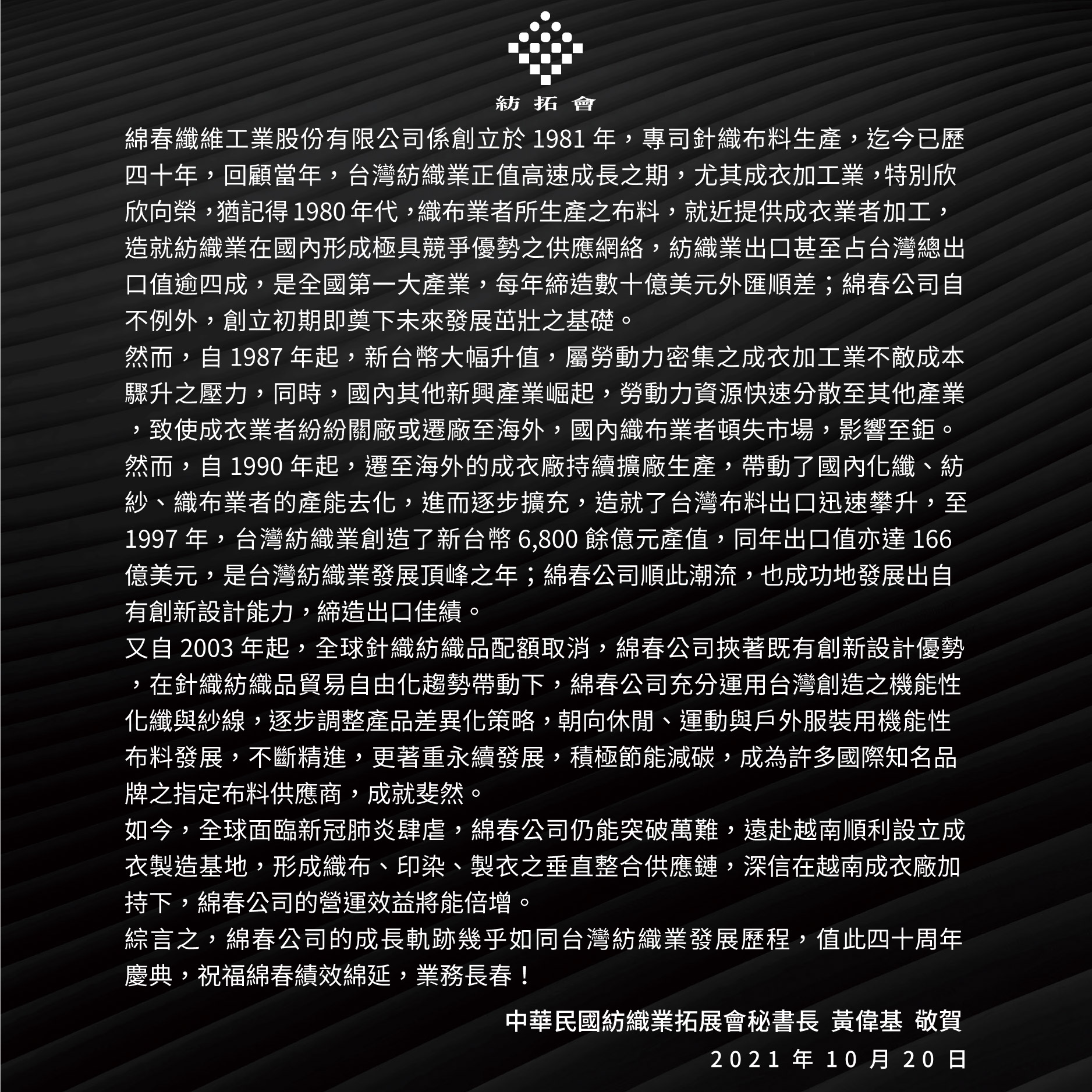 綜言之,綿春公司的成長軌跡幾乎如同台灣紡織業發展歷程,值此四十周年慶典,祝福綿春績效綿延,業務長春!