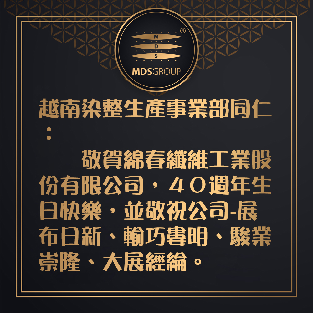 敬賀綿春纖維工業股份有限公司,40週年生日快樂,並敬祝公司-展布日新、輸巧婁明、駿業崇隆、大展經綸。